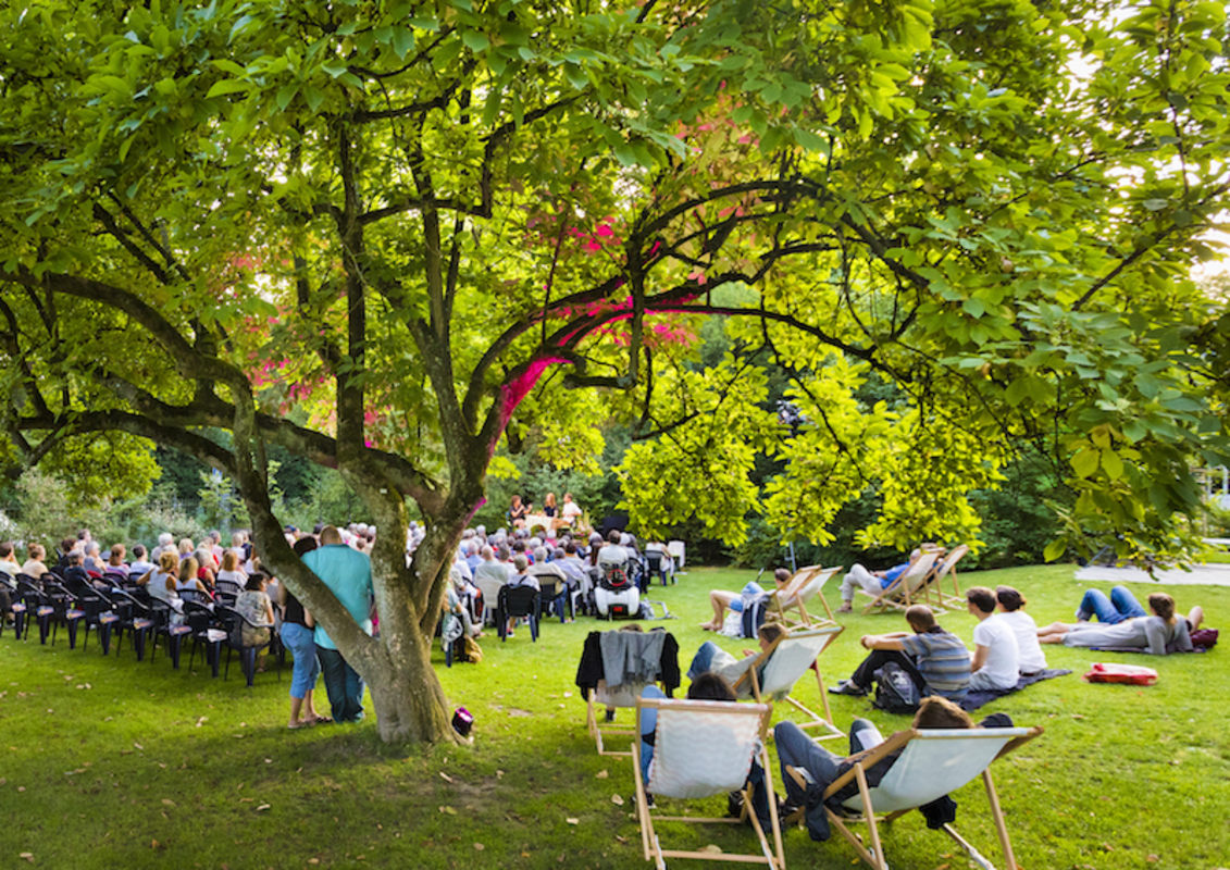 Raoul Schrott und Big Zis, Musik: Fatima Dunn, Moderation: Mikael Krogerus: lauschig und philosphisch — Garten des Kinderhauses Winterthur ZH