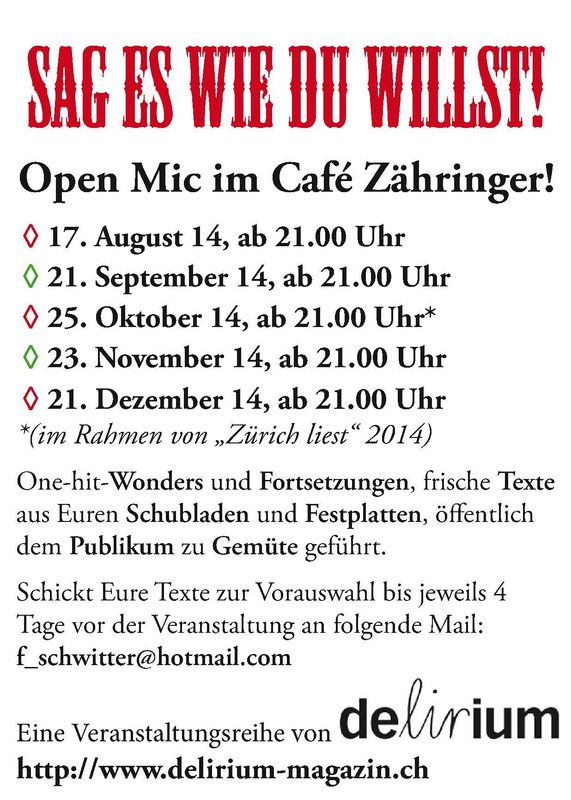 Offene Bühne - Einmal pro Monat laden wir alle Schreibenden aus Zürich und Umgebung zu einer offenen Bühne im Café Zähringer ein. Nächstes Datum: 21.09.2014 - 21 Uhr.